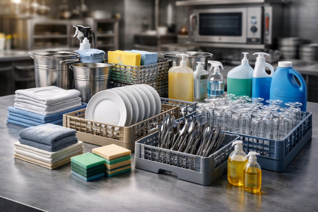 Essential stewarding supplies designed to support kitchen hygiene, organization, and smooth service operations.
